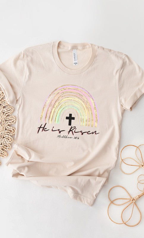 He Is Risen Easter Glitter Rainbow Graphic Tee